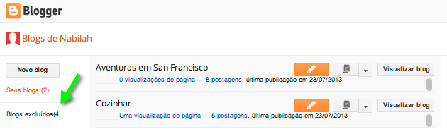 O título do blog excluído aparecerá na seção "Blogs excluídos" por um curto período de tempo após você excluir seu blog. Durante esse período, você poderá clicar em Blogs excluídos no lado esquerdo de seu Painel do Blogger para ver os títulos de seus blogs excluídos recentemente.